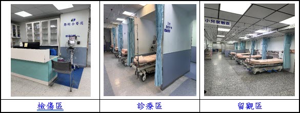 本院急診室空間明亮、環境寬敞、舒適,區域分為:檢傷區、候診區、急救區、治療區、診療區、留觀區(含兒科留觀區)、婦產科診療(內診)室、會談室、隔離室。