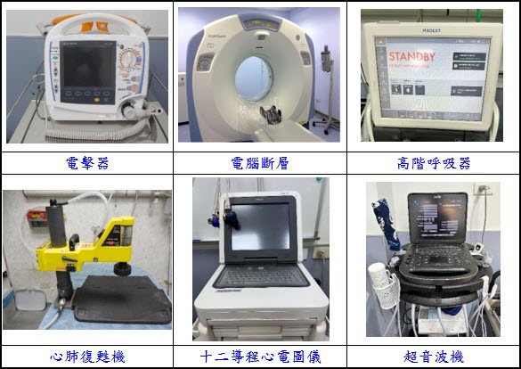 為提供緊急傷病病患適切的醫療服務,設有現代化且先進的醫療設備,如:電腦斷層、多項監測設備(電擊器、三合一生理監視器)、十二導程心電圖儀、高階呼吸器以及超音波機、X光等…;且各項醫療設備、儀器皆有定期保養,以提供急診病人24小時迅速精確之緊急醫療服務。